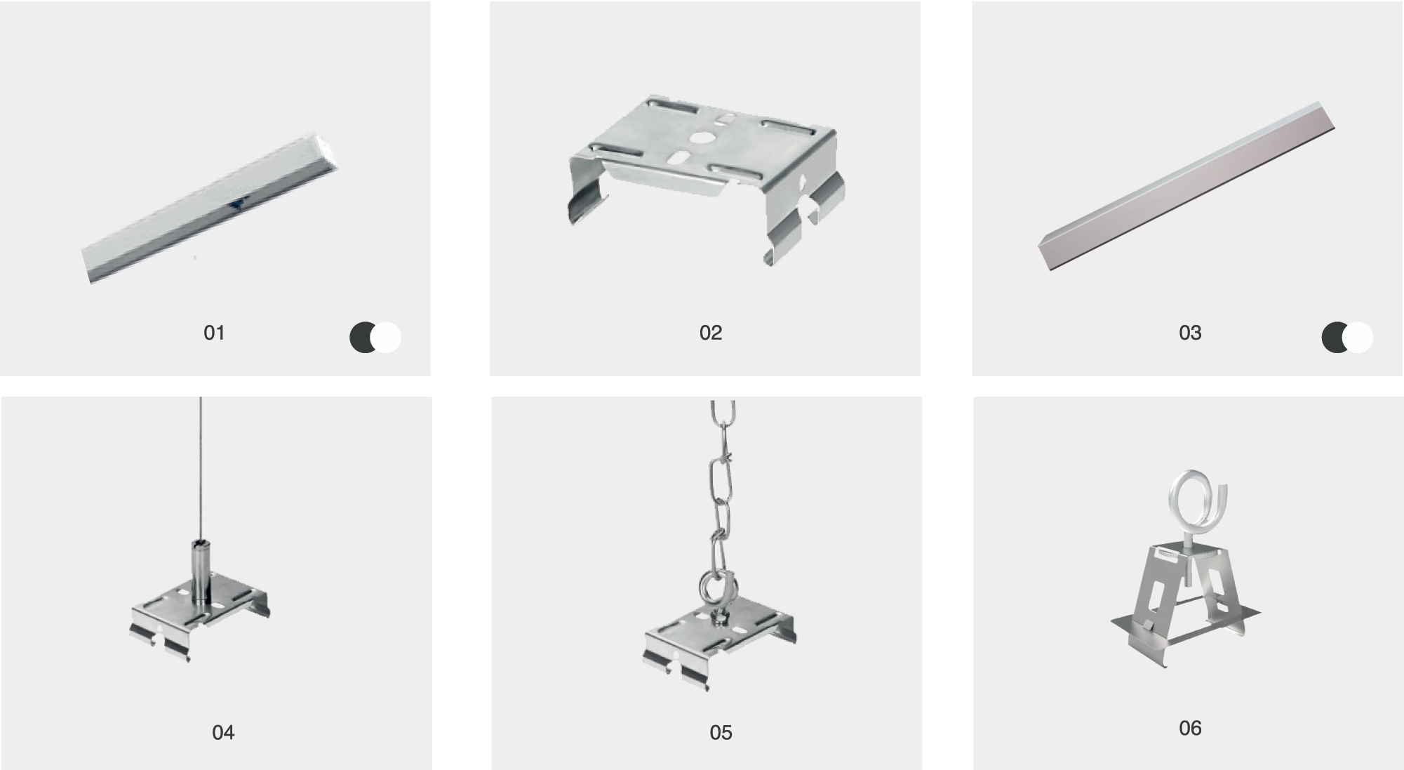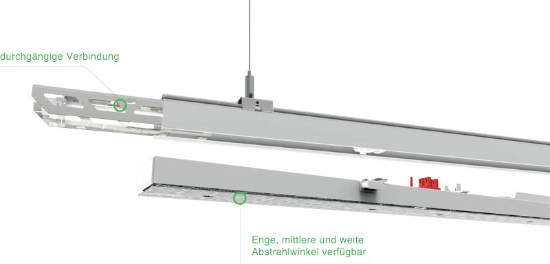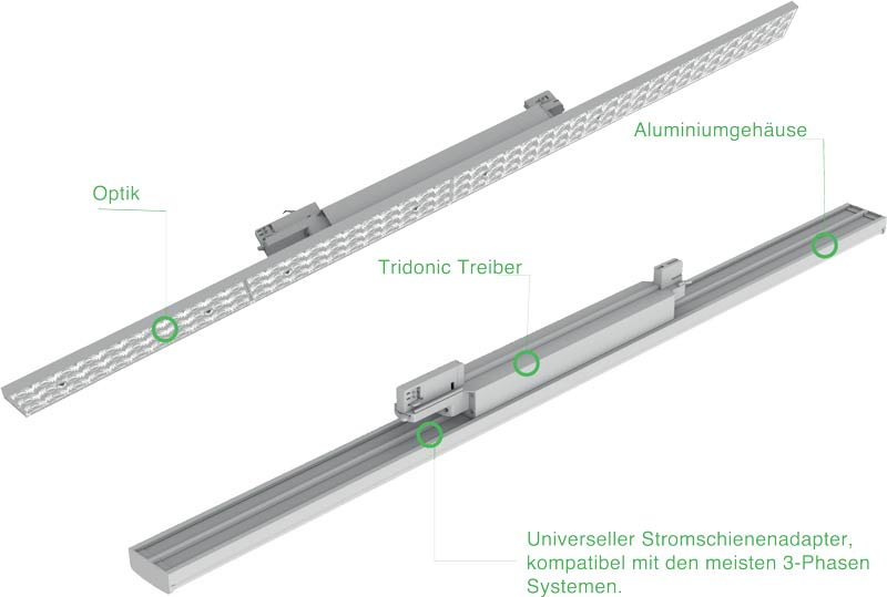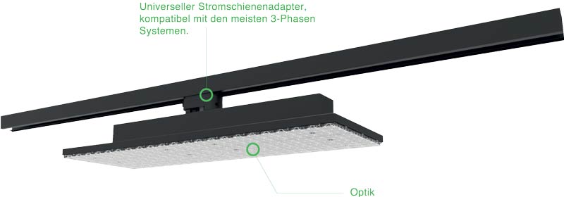 Trägerprofile erfolgt mittels 5-, 7- oder 11-poligem Steckverbinder. Die mechanische Verbindung wird werkzeuglos über Hebelverschlüsse durchgeführt. Der LED-Leuchteneinsatz besteht ebenfalls aus einem robusten Aluminiumprofil. Die Phaseneinteilung ist am Stecker des Leuchteneinsatzes frei wählbar.
