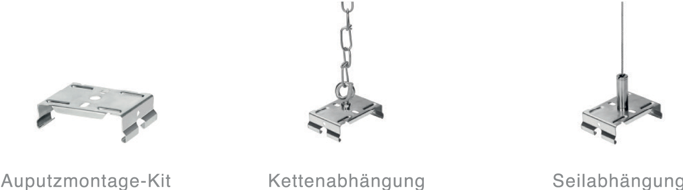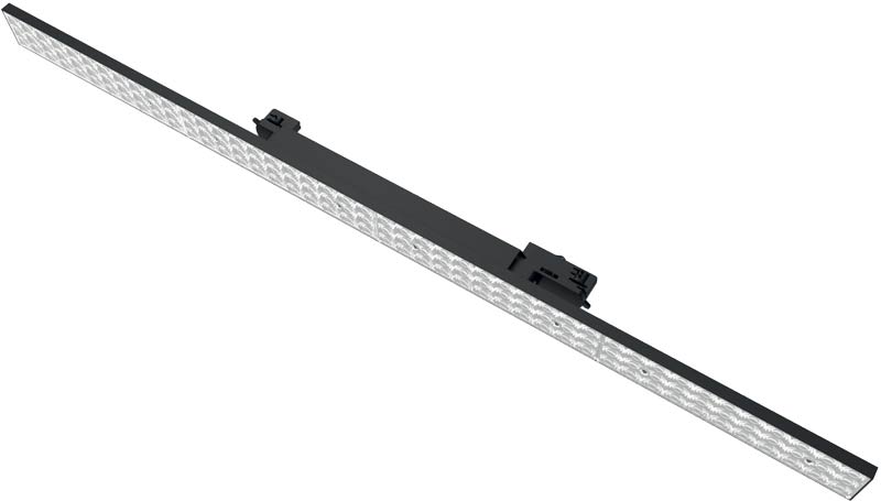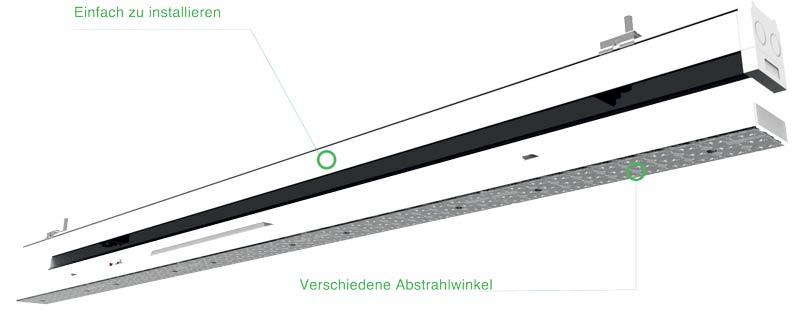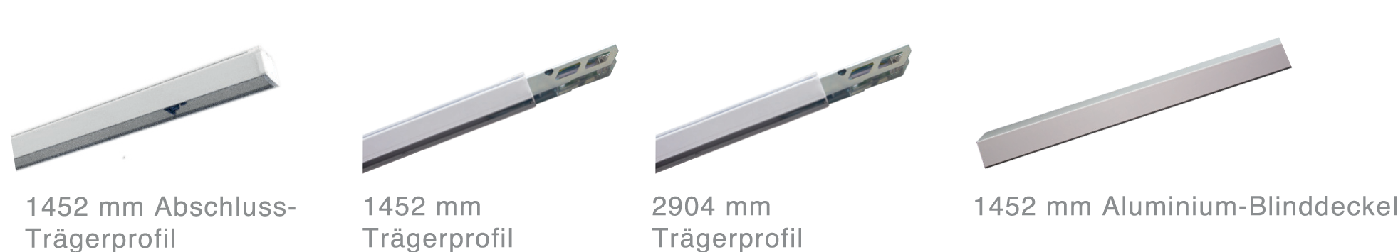 Der LED-Leuchteneinsatz besteht ebenfalls aus einem robusten Aluminiumprofil. Die Phaseneinteilung ist am Stecker des Leuchteneinsatzes frei wählbar. Der 1-längige Leuchteneinsatz kann mittels Einrastmechanismus im mehrlängigen Trägerprofil frei positioniert werden.